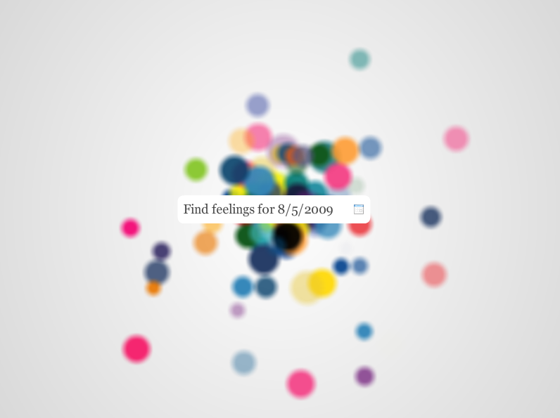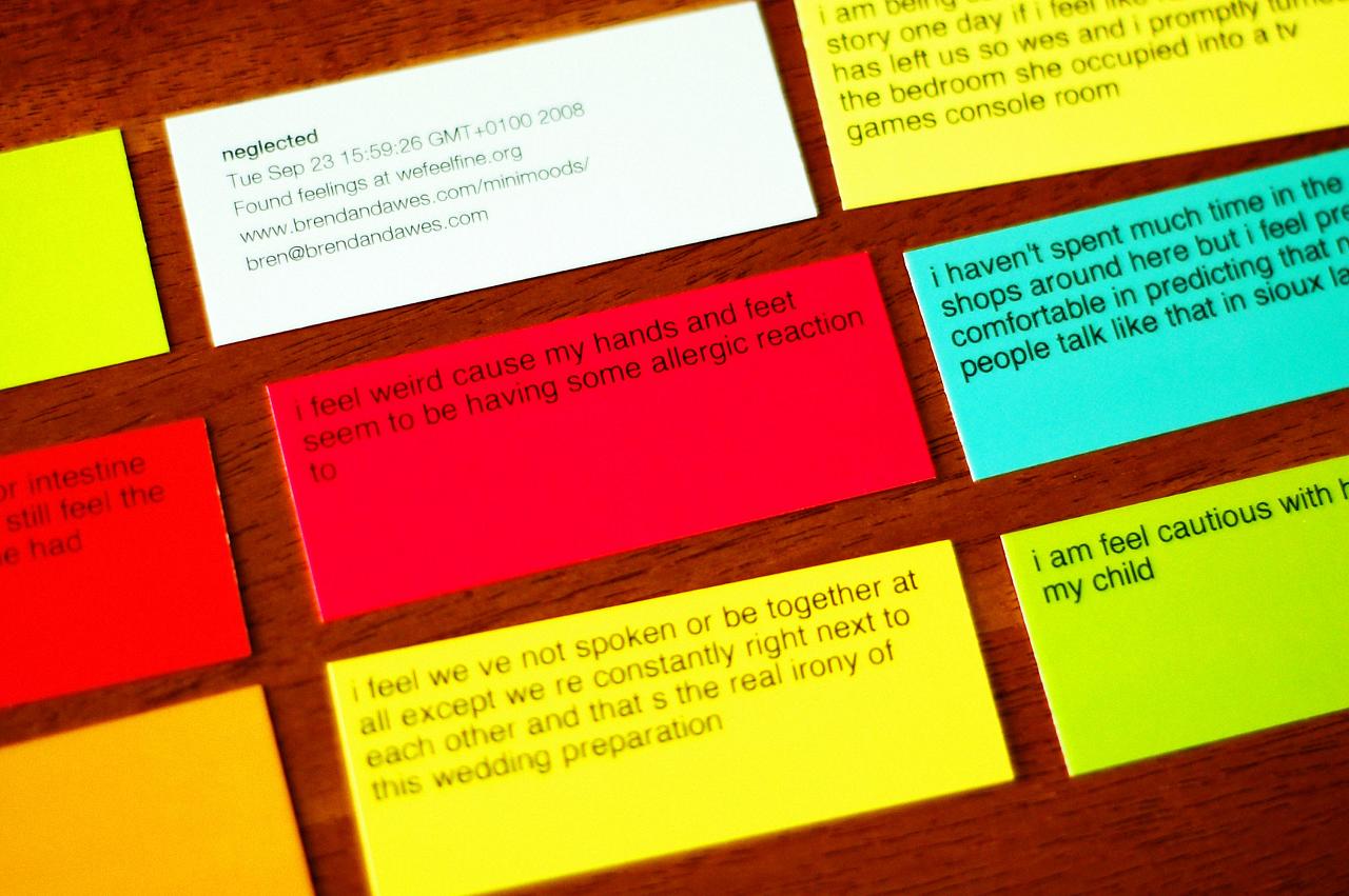 Inspired by the wonderful We Feel Fine, 100 Feelings Felt allows you to select a date whereupon 100 feelings—captured from across the web via the We Feel Fine API—are shown on screen. The system then allows you to select some or all of the feelings and then receive them as printed mini Moo cards, so you can keep them forever rather than simply existing as temporary bits of data.