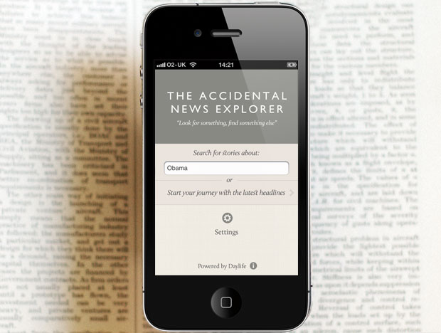 The Accidental News Explorer is my first fully fledged iPhone app. Based on the same mechanic as my Doodlebuzz project the app celebrates chance encounters and serendipity. Start by searching for a subject. Once you've browsed the suggested articles taken from hundreds of news sources, tap the “related topics” button to discover connected topics, which in turn lead to more articles. Each article leads to new things; the more curious you are, the longer your journey will be.