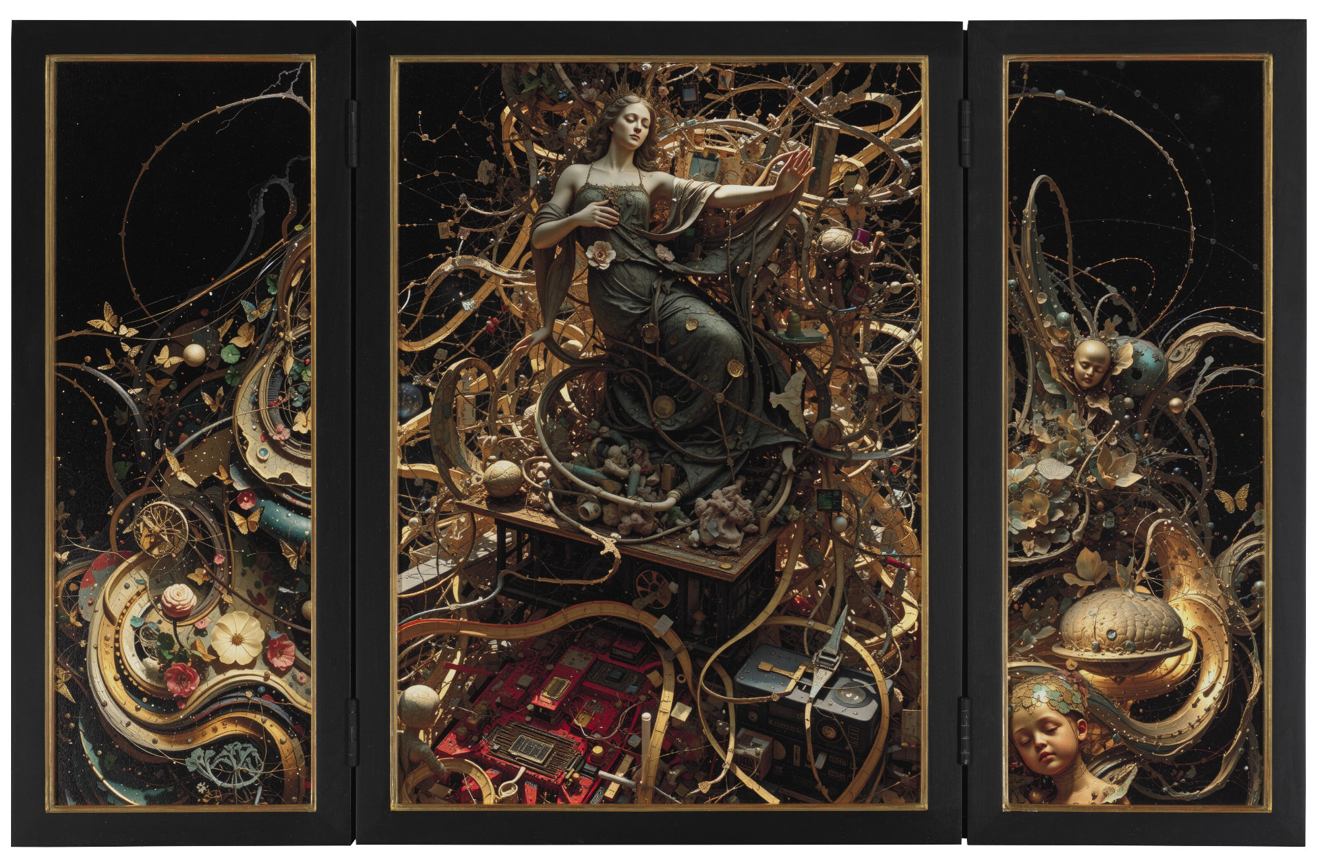 Rendered as a triptych, the artwork recalls the form of a church altarpiece, juxtaposing tradition and innovation to explore the tension between strategy and spontaneity in an era defined by rapid technological change. The three panels represent the underlying architecture of how all modern computers work as first proposed by John von Neumann: input, processing, output. At its centre is a surreal composition featuring a female figure holding an orb, evoking divinity or a spiritual essence. The imagery is a complex fusion of classical and futuristic aesthetics, and is created from structural models designed by Dawes for each image, which he then developed using the image generation interface ComfyUI.