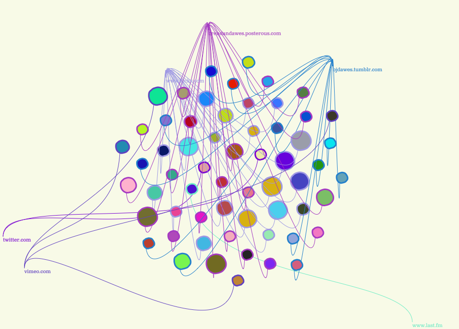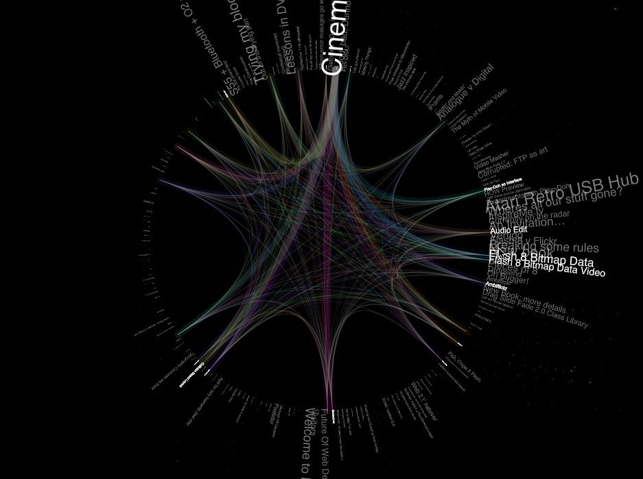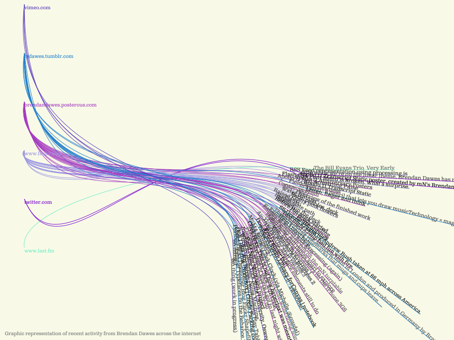 As part of a previous version of brendandawes.com, the homepage featured various data visualisations that flipped between showing an aggregated view of the different feeds I have out there on the web, as well as a circular exploration of the content taken from my previous Wordpress powered site.