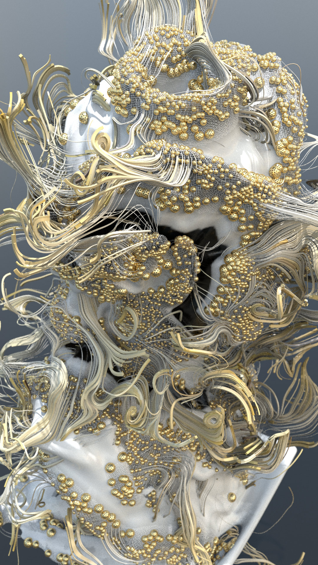 Translated into a new form using Antonio Vivaldiās Four Seasons (Spring) that describes freshness and beauty, the bust of Aphrodite is an interrelation between an extraordinary bouquet of delicate white petals and shiny golden spheres in largo; and a sonic visualization resembling a sea foam in allegro. Shadows of the Baroque are combined with the latest generative techniques using code and a procedural computational system. Different tempos are exchanged within the work that captures the basis of the Ritornello form used in Spring (of the Four Seasons).