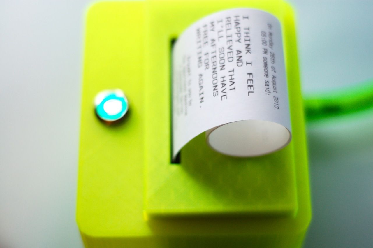 Inspired by a passage from Ray Bradbury's Dandelion Wine, The Happiness Machine is an Internet connected printer that prints random happy thoughts by random people from across the web.