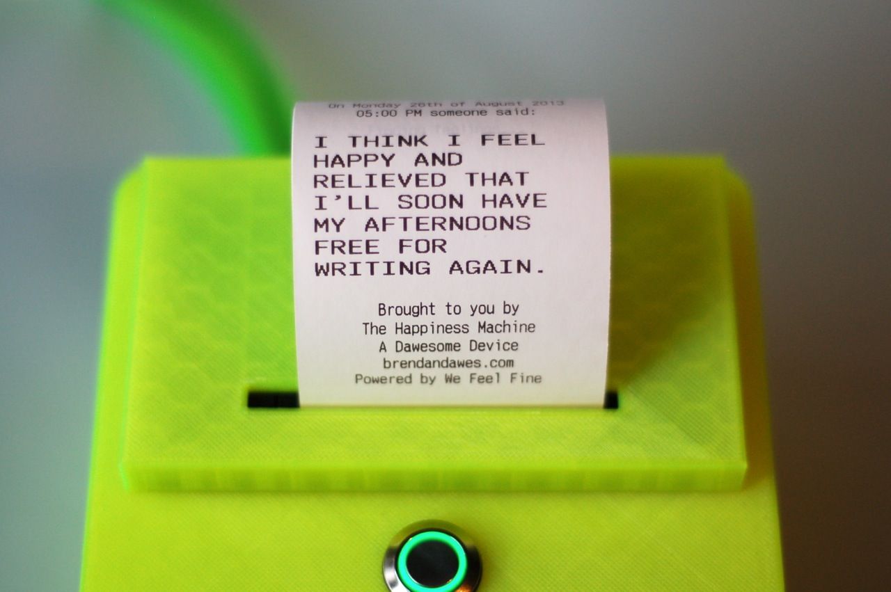 For me the Internet is not a network of machines but a network of people. Yet it's all too easy to forget that behind that screen name or that Twitter handle is a real human being. The Happiness Machine, powered by We Feel Fine, is designed to remind us of this fact, presenting random feelings from people we've never met, in a tactile physical form that you can tear-off and take away.