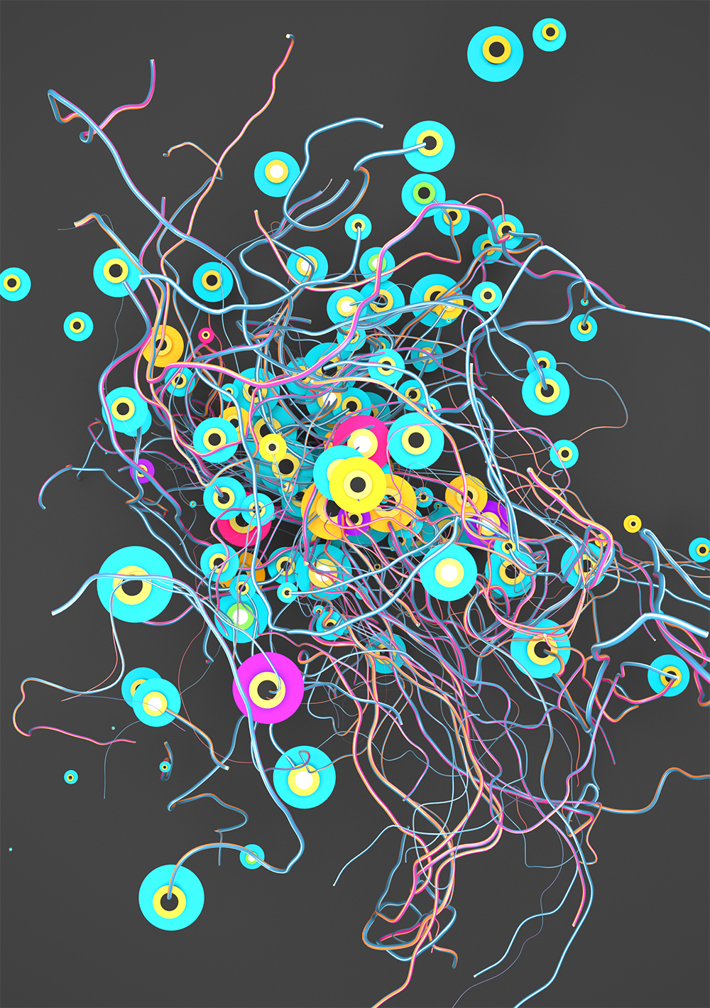After several iterations, the final image, created in Houdini, used a series of three concentric disks. The larger out disk represented on of the four countries attendees came from — mostly Germany but also included Austria, Switzerland and Ireland. The middle disk represented if they were vegetarian or not — green if they were. The smallest disk was black for male and white for female. Intertwined within all this are branch like structures, inspired by the surrounding forest, but also to represent the connections that are made at these type of conferences.