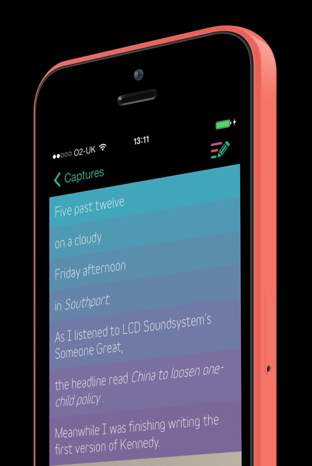 With a single tap Kennedy will capture your location, the date and time, the current weather conditions, the latest world news headlines together with what music you're listening to at the time. Add a note or a photo and then save it to the archive of captured moments.