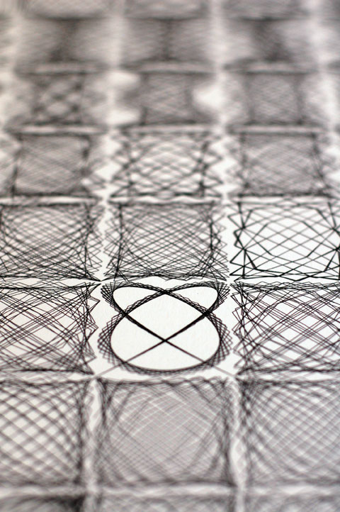 Based on the visual used in my talk for TedX Manchester in 2012 and limited to 50 prints, the image shows 54 Lissajous curves with each curve only separated programatically by a factor of one. For the most part the curves look very similar as they iterate from the top and then left to right; but occasionally and suddenly – amongst the seemingly average forms – leaps beautifully unexpected shapes.