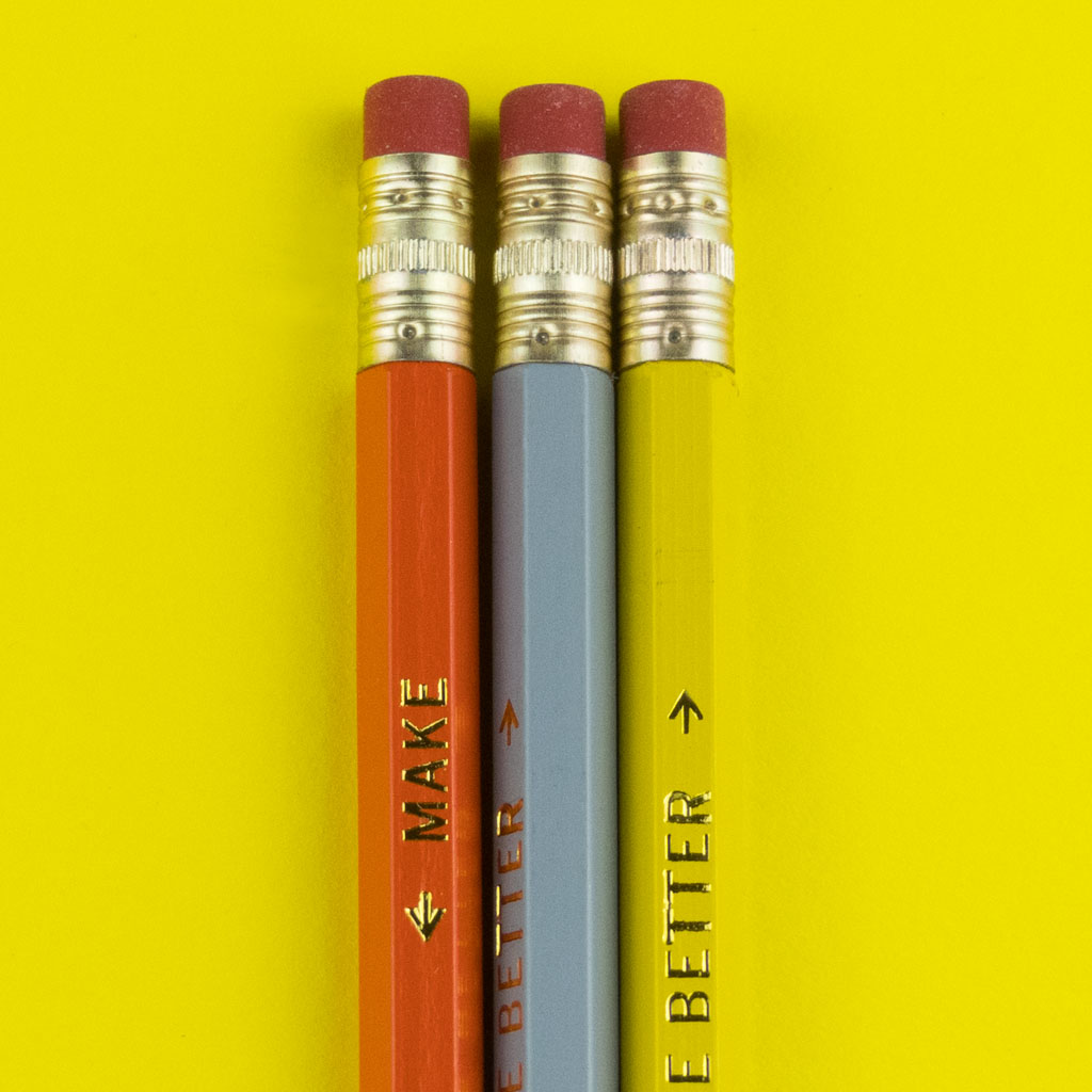 The three pencils — made in New York City and stamped in gold foil on a 1960s Kingsley hot-foil press — feature a further message about the importance of silence and the power of subtraction.