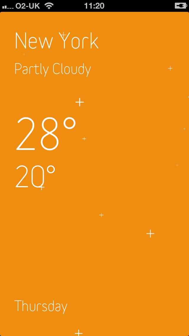 Instead of the expected weather icons, Now Next Later uses a cross based particle system to show current conditions including rain, wind speed, clouds and snow.
