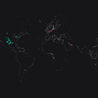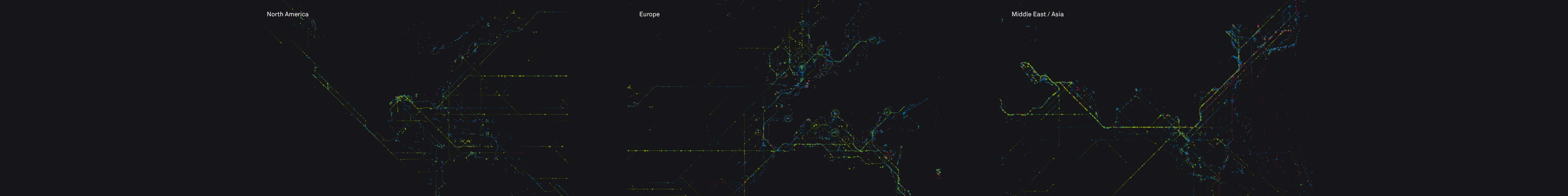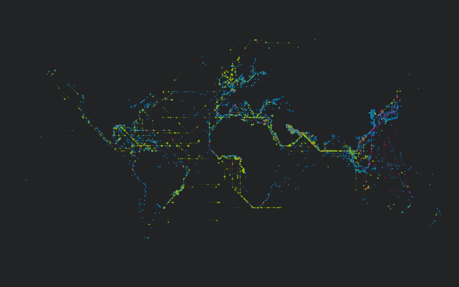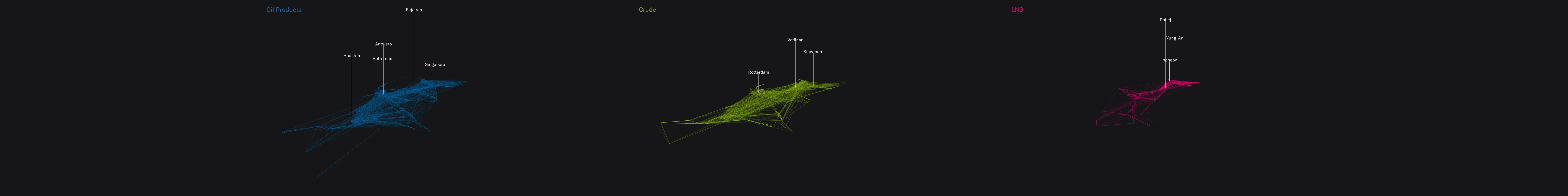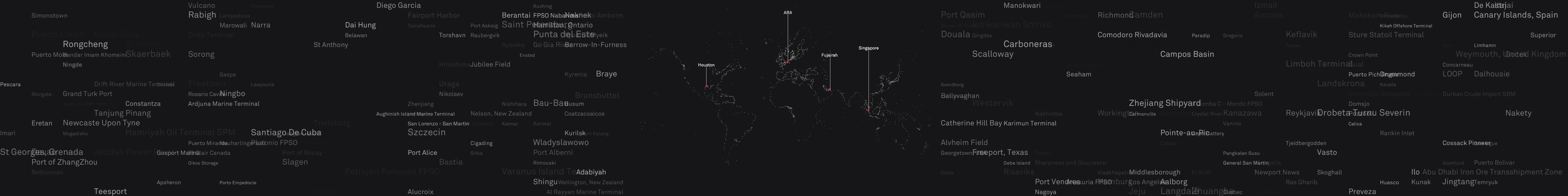 Probably my favourite parts of this project were the happy accidents that appeared as I started to play around visualising the data. Firstly there is no map displayed at any point. Instead the map of the world is creatad entirely by the small dots making up each of the ports around the world. Secondly, as I was working on a land avoidance system that the ships could follow, I created a kind of "crow flies" visualisation of various types of shipping routes, something that I thought the client wouldn't be into. As it turned out they loved these crow-flies interpretaions of their data, so much so that these graphics were used as the visual for the official invite to experience the visualisation during the oil forum event.