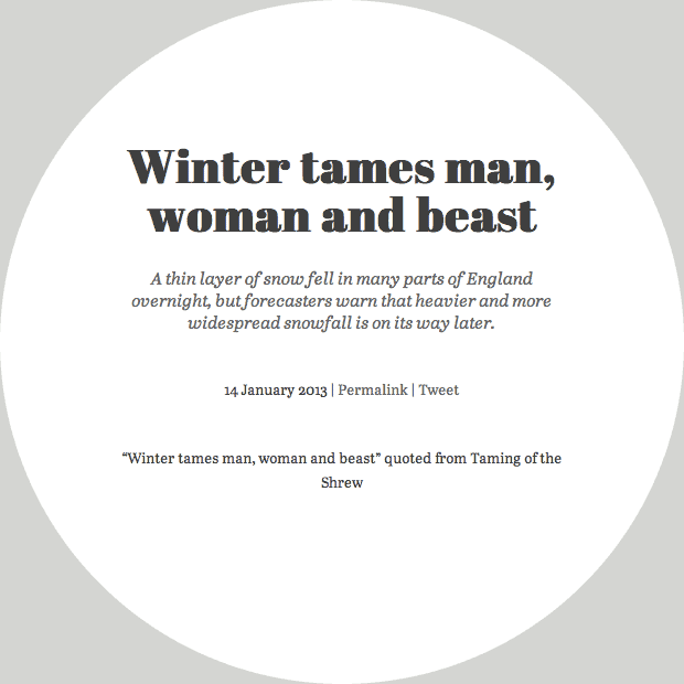 Early signs on how the system was working were promising but my knowledge of Shakespeare was sadly lacking; it needed more depth. Thankfully I then started to work with a young intern at the RSC who could offer real insight into the database that powered the system. The matches now started to really come together; here was Shakespeare describing events in real-time, showing the timeless nature of the words that he wrote and how even now – hundreds of years later – Shakespeare's work is as relevant today as it ever was.