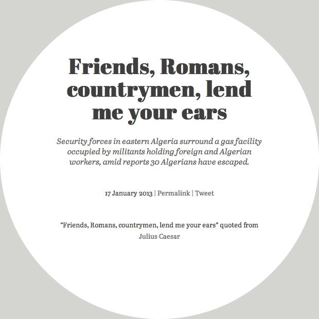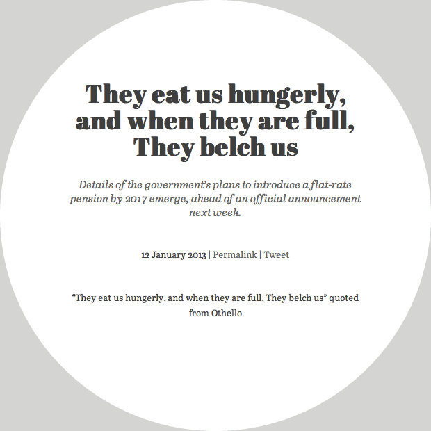 As well as writing the code, I started to play with how it would look, wanting something incredibly simple, letting the words speak for themselves free from distractions or ornament. The circles were in-part inspired by the dots from Alan Fletcher's original Reuters identity; each circle representing a specific news event within the ticker tape like nature of rolling news. I wanted it to look very typographic – almost as if each one could be printed out as a "thing".